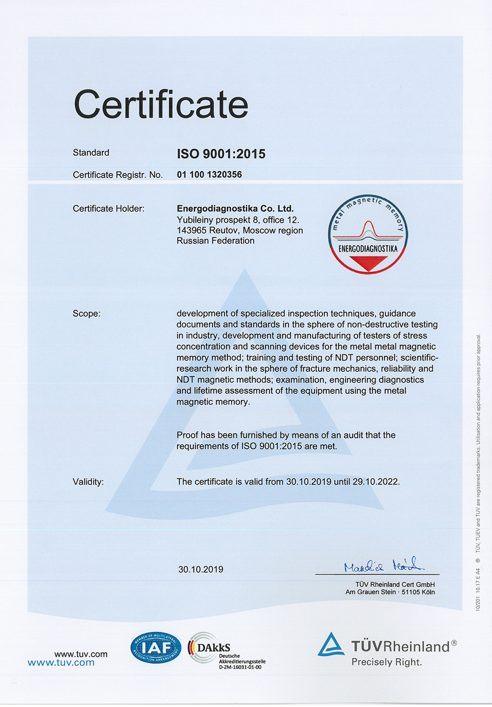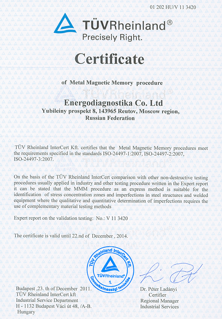 北京磁微科技有限公司是俄罗斯动力诊断公司金属磁记忆检测法全系列产品的中国区代理商和服务商。俄罗斯动力诊断公司是俄罗斯焊接学会(RWS)的合作伙伴,是“工业安全、风险管理、控制与监测”科学工业单位(SIU“RISCOM”)的活跃成员,是“工业安全领域跨区域协会”自律组织(SRO NP“MEZHREGION IS”)的创始人,担任俄罗斯联邦工程监管与计量局技术委员会TC 132下属小组委员会PK 1“结构安全系统(SSS)检查与寿命”的负责人;同时担任国际无损检测委员会(ICNDT)金属磁记忆法专家国际小组以及国际焊接学会(IIW)C-V-E-a分委员会的负责人。