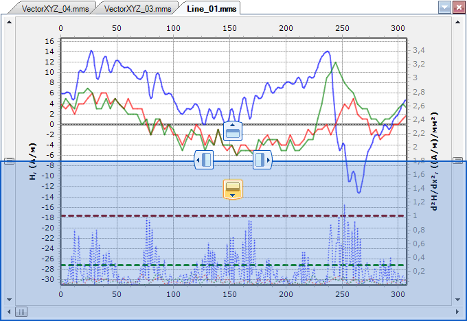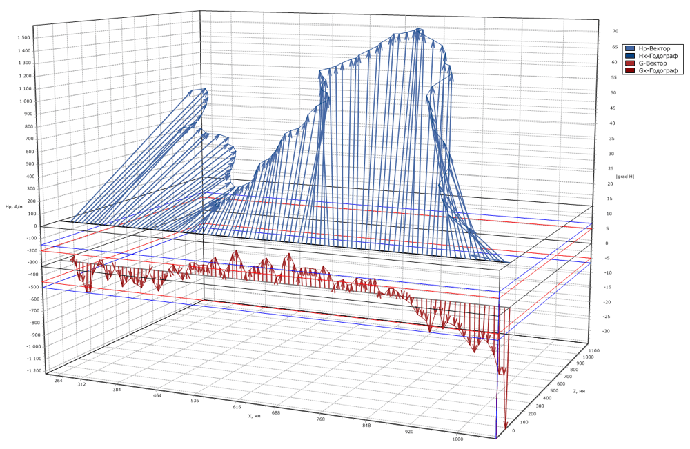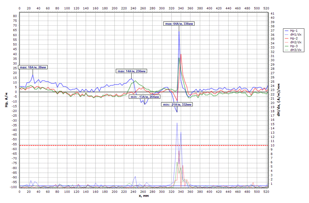 该程序利用剩余磁化分布图(Нр图),可自动绘制微分分布图、Нр梯度图(dH/dx、dH/dz、|grad Hp|图)以及其他表征应力集中程度的诊断参数图。根据检测技术,利用这些图表,可以识别出极限应力集中区域(损伤发展区域)。