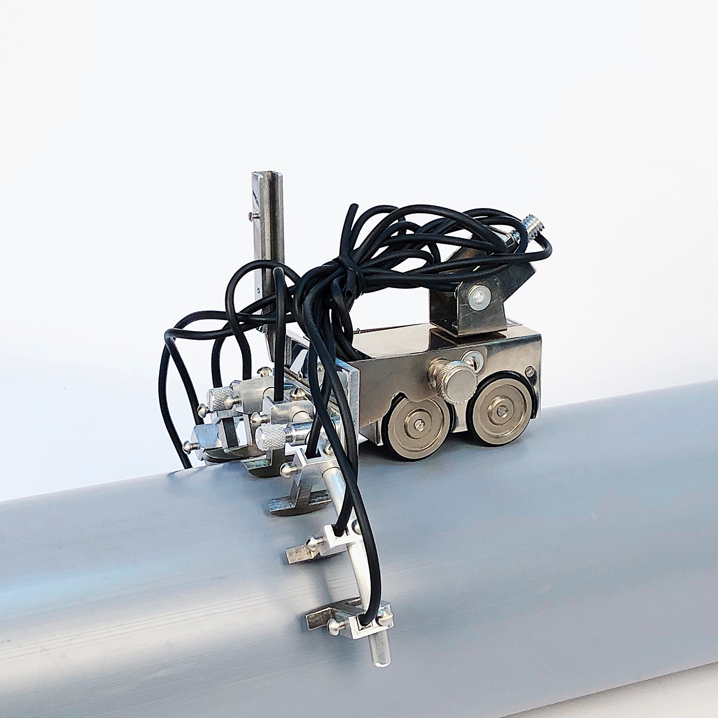 该扫描装置配备8个磁通门传感器,用于测量法向磁场分量,专为大直径管道、容器和设备外壳检查而设计。它是在1-8M型扫描设备的基础上制造的。磁通门传感器之间的延长距离可以提高大直径管道、容器和设备外壳检查的速度。